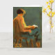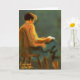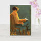 Eine komplett bekleidete Figur-Studie. Eine Frau mit kurzem Haar sitzt bequem auf einem Holzstuhl, während sie ein Buch liest. Die Sonne scheint auf ihrem Gesicht, während sie sich meistens von der Aussicht abwendet.