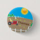 Kindergeschenke und Accessoires mit farbenfroher Grafik eines Bauern in seinem Traktor, der an einem sonnigen Tag zu seinem Bauernhof tendiert. Personalisiert mit dem Namen Ihres Kindes im frisch gepflügten Feld.