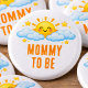 Eine niedliche, sonnige Illustration mit einer lächelnden gelben Sonne, die über sanften blauen Wolken und kleinen goldenen Sternen aufgeht. Die helle, spielerische Farbpalette und der freundliche Cartoon-Stil erfassen die freudige Atmosphäre einer Sonnenbaby-Feier. Fette Buchstaben betonen die besondere Rolle der werdenden Mutter und schaffen ein lustiges und unvergessliches Abzeichen-Design, das perfekt für Fotos, Party-Outfits und fröhliche Feiermomente ist.