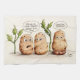 Funny Pun über Kartoffeln. Ein zeichn von drei Kartoffeln. Der erste frag: Warum heißen wir Kartoffeln? Wir haben keine Zehen. Der dritte hat große Füße mit großen Zehen und sagt: Sprich für dich! Kalkgrüner Hintergrund
