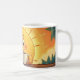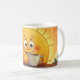 Ein skurriler Cartoon einer personifizierten Sonne, der bei Morgengrauen eine dampfende Tasse Kaffee genießt. Set vor einer warmen, tropischen Kulisse mit Blätter aus Palmen, das Bild zeigt die gemütliche, fröhliche Essenz eines perfekten Morgenbeginns.