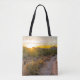 Das Bild zeigt den Sonnenaufgang über den Bergen, der die Wüste und den Weg beleuchtet