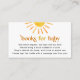 Eine Reservierungskarte für Babydusche. Mit Aquarellsonne mit Retro-Text und Gedicht: "EINE KLEINE ANFRAGE, HOFFEN WIR NICHT ZU SCHWIERIG BITTE BRINGEN EIN BUCH ANSTATT EINER KARTE, DIE SIE DAS BUCH CHERISIEREN, GUT LIEBT ODER NEUE BITTE UNTERZEICHNEN SIE DAS INNEN MIT EINER BOTSCHAFT VON IHNEN!"