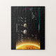 Ein jigsw des Sonnensystems, das alle Planeten und zwergartige Planeten zur Skala und im korrekten Auftrag vom Sun zeigt. Schließt die Größe, die Masse und den Augenhöhlenzeitraum jedes Gegenstandes ein. Hat auch eine Skalagraphik, den Augenhöhlenabstand jedes Gegenstandes vom Sun zu zeigen. Hintergrund-Grafik NASA/JPL.