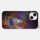 Ein mehrfarbiges Fraktal, das an eine Wand aus Tempeln erinnert, die mit polychromen Schnitzereien verziert ist. Die Hauptfarben sind Blau und Orange. Passen Sie Ihren eigenen Text an.