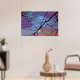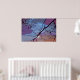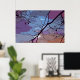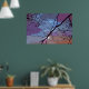 Dieses schöne Kunstposter zeigt ein abstraktes Muster schwarzer Äste gegen einen Sonnenuntergangshimmel mit Regenbogenfarben lila, blau, weiß, rosa, orange, grau und magenta.