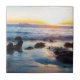 Ozeanwellen, die über Felsen auf einem Strand während des Sonnenuntergangs fließen.