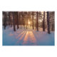 Sonnenuntergang im schneebedeckten Kiefernwald Fotodruck