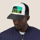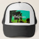 Fernlastfahrerhut mit dem Bild einiger Palmen im blauen und orange Sonnenuntergang mit "Kalifornien" geschrieben in die tote Mitte mit weißem Cursive. Die Liebe I, die auf Reisen zu Kalifornien gehen, und dieser Hut ist eine Erinnerung aller meiner Ferien dort.