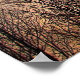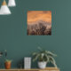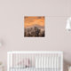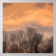 Dieses hübsche, zeitgenössische Poster besticht durch ein beeindruckendes abstraktes Design aus schwarzen, silbernen Bäumen und einen Sonnenuntergangssaal mit Orangen-, Lachs-, Gold-, Braun-, Lila- und lila Wolken.