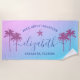 Das personalisierte Strandtuchdesign für einen Mädchenurlaub in Strandnähe trägt einen eigenen Vornamen in modernem Schriftzeichen mit Seestern und gerahmt von tropischen Palmen. Personalisieren Sie das Programm mit einem Namen und einem benutzerdefinierten Text für den besondere Anlass. Im Hintergrund ist ein hübscher Sonnenuntergang in violett, lila und blau gehalten.