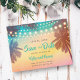 Diese farbenfrohe Save the Date Postcard besticht durch eine Strandlandschaft bei Sonnenuntergang mit Palmen, einen warmen Himmel und das aufgehängte Licht. Das Design ist perfekt für eine Sommerhochzeit, eine Strandhochzeit oder eine Hochzeit in Urlaubsort. Die Illustration und Farbpalette haben ein Vintages Retro-Gefühl, während die Saitenlichter eine moderne und schicke Touch verleihen.