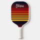 Farbenvolles Streifenmuster mit individuellem Namen Pickleball Paddle. Ein farbenfroher Streifen, der von einem Sonnenuntergang inspiriert wird. Die Streifen sind in verschiedenen dunkelblauen, dunkelrosa, roten, orangefarbenen und gelben Farbtönen gehalten. Sie können einfach Ihren Namen oder Monogramm hinzufügen, um dies zu einer persönlichen Palette zu machen, die sich herausstellen wird. Der Name ist ein Skript in einem großen weißen Format.