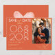 Eine moderne Save the Date Karte in trendigem, hellen Orange. Dieser Orangenschatten heißt Verona Sunset. Details in Imitaten goldene Silhuette einer delikaten Blume. Moderne große Typografie, die das Datum der Hochzeit herstellt, hebt sich ab.