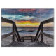 Atemberaubender, lebendiger Sonnenuntergang über Strand und Ozean aus einem alten Holzdeck.