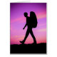 Silhouette eines Wanderers mit Rucksack gegen einen lila Sonnenuntergang