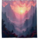 Ein atemberaubender Sonnenuntergang taucht eine gebirgige Landschaft in lebendige Farbtöne von Rosa und Orange, wobei die Sonne ein weiches Licht über nebelbedeckte Täler wirft. Hohe Kiefern zieren die Hänge und unterstreichen die ruhige Schönheit der Szene.