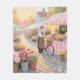 Eine charmante europäische Straße erstrahlt im warmen goldenen Licht der Stunde auf einem Kopfsteinpflasterweg. Eine Frau in einer braunen Schürze arrangiert einen lebendigen Blumenstrauß neben ihrem Fahrrad mit einem Korb voller Blüten, umgeben von überquellenden Auslagen aus rosa Rosen, Tulpen, Pfingstrosen und farbenfrohen Blumen unter rosa-weiß gestreiften Markisen. Diese fröhliche, nostalgische Illustration strahlt Wärme, Frische und fröhliche Frühlingsstimmung aus.