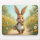 Ein niedliches, braunes Kaninchen mit blauer Schürze und einem Korb, geht einen von der Blume gesäumten Weg entlang