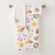 Sommerelemente wie Sonne, Beachball, Bikini, Sonnenmütze, Eis und Flip Flops auf weißem Hintergrund. Perfektes Design für Mädchen, Frauen und Kinder