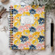 Personalisieren Sie diesen sonnigen Planer mit Ihrem Namen in dunkelblau kursiv gerahmt durch ein weißes Rechteck, auf einem kühnen, farbenfrohen Hintergrund von Aquarellfarben-Blume in den Farbtönen Gelb, Rosa und Marineblau.