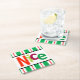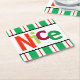 Bist du unartig oder nett? Diese bunten Untersetzer lesen "Nice" in moderner Typografie auf einem weißen Hintergrund mit einem Rand von schwarzen Kamelen und einem grünen, weißen und rot gestreiften Muster. Ideal für Feiertage! Auch passende "Naughty"-Untersetzer sind verfügbar. Entworfen von Künstler © Tim Coffey.