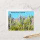 Viel Kakteen in der Wüste mit blauem Himmel und einem Berg im Hintergrund, dazu eine Palme.