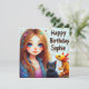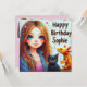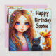 Das süße Mädchen mit einer schwarzen Katze und einem Axolotl feiert Sophie's Geburtstag. Die Grüße auf der Karte sind "Glücklich Geburtstag Sophie". Auf der Rückseite der Karte ist eine kleine Version des vorderen Bildes, und viel Platz, um eine Nachricht zu schreiben. Made mit der Unterstützung von AI Bing.