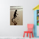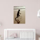 Ein kleiner Junge spielt am Strand in Senegal, Afrika. Die Silhouette eines Fischersohns, der mit dem uralten klassischen Spielzeug, dem Hoop und dem Stick beim Surfen spielt.