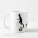 Wie alle Kaffee Morgen sollte sein! Ein kleiner Junge spielt am Strand in Senegal, Afrika. Die Silhouette eines Fischersohns, der mit dem uralten klassischen Spielzeug, dem Hoop und dem Stick beim Surfen spielt.