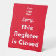 Sie können den weißen Bildschirmtext bearbeiten, um eine benutzerdefinierte Nachricht für Ihr Unternehmen zu erstellen. Auf dem roten Schild steht: Sorry, dieses Register ist geschlossen. Die oberste Zeile des Anzeigetextes ist ein Skript. Ein Bild ist über dem Text. Sie können das Bild durch Ihr Firmenlogo ersetzen.