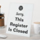 Sie können den schwarzen Bildschirmtext bearbeiten, um eine benutzerdefinierte Nachricht für Ihr Unternehmen zu erstellen. Auf dem weißen Schild steht: Sorry, dieses Register ist geschlossen. Die oberste Zeile des Anzeigetextes ist ein Skript. Ein Bild ist über dem Text. Sie können das Bild durch Ihr Firmenlogo ersetzen.