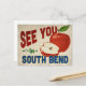 Eine bezaubernde South Bend Indiana Vintage Reise-Postkarte mit einem schönen roten Apfel, zusammen mit lustigen Retro-Text, der sagt: "See you in South Bend"