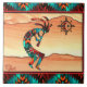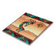 Brighten Sie Ihre Zuhause mit dieser einzigartigen "One of a Kind" Südwest Kokopelli Tile! Es besitzt ein südwestliches Kokopelli, das Flute spielt und unter der Sonne in der Wüste tanzt..Umgeben von einer Südwestgrenze in Türkis, Orange & Schwarz. Das ist ein originelles Kunstdesign des Künstlers Kerry Miller.