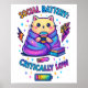 Lebhaftes, buntes Design mit einer gemütlichen Katze in einer Decke verpackt, neben einem Stapel Bücher sitzen und Kaffee trinken. Der farbige Text lautet: "Soziale Batterie kritisch niedrig". Dieses Design ist auf einer Vielzahl von Produkten erhältlich.