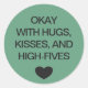 Sozialer distanzierender farbkodierter grüner Aufkleber, der Ihnen und Ihren Hochzeitsgästen hilft, sich sicher und komfortabel mit Ihren sozialen Interaktionen zu fühlen und anderen lasse, zu wissen, mit welchem Maß an sozialer Distanz Sie sich wohl fühlen. Der anpassbare Text lautet "OKAY WITH HUGS, KISSES, AND HIGH-FIVES". In meiner Sammlung "Soziale Distanz, Gesichtsmaske und Sanierungsstationen" sind passende Artikel und Unterrichtszeichen verfügbar.