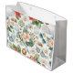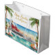 This bright modern watercolor large gift bag features a funny, glamorous close-up of Santa Claus at a California spa — complete with cucumber slices on his eyes, a white towel turban, and a red-and-white Hawaiian shirt peeking through.