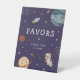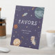 Cute space themed kids birthday favors pedestal sign featuring playful astronaut, planet and star illustrations paired with fun, stylish typography on different color backgrounds. You can find more matching items from this collection in our store.
