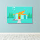 Dieses Space Age Cartoon House Stretched Canvas Print ist ein Retro-Liebhaber Traum wahr geworden. Das minimalistische Design der Kunst besticht durch ein Aqua-Stein-Haus mit großen, Pfauenblauen Fenstern. An der atomaren, schrägen, orangefarbenen Decke hängt eine gelbe Sputnikleuchte, die die Eingangstür beleuchtet. Die rote Vordertür mit Türknauf aus Sternexplosion wird durch die senkrechten grünen Holzplanken des Eingangs schön verdeckt. Ein Weg aus grauem Stein führt über den unberührten Rasen, der im Mondschein türkisfarben erscheint. Hinter dem Haus ragt eine große, dünne Baumreihe zum türkisblauen Himmel und zur weißen Silhouette eines Vollmonds. Obwohl keine Menschen sichtbar sind, schauen sich die Einwohner des Kitschhauses in einer Nacht wie dieser wohl die Nachrichten der Astronauten an.