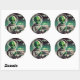 This delightfully weird set of stickers features a vintage-style illustration of a green space alien holding a birthday cake, glowing with lit candles as it stands under a cosmic sky filled with stars, birthday balloons, and a mysterious hovering UFO. It’s an unexpected and totally charming blend of pop surrealism, lowbrow art, retro science fiction, and interstellar whimsy—perfect for anyone who thinks birthdays should be just a little stranger. The alien itself, with its oversized head and expressionless face, stands stoically yet somehow sweetly, as if it’s traveled light years to crash your party with cake in hand. This is the kind of image that walks the line between heartfelt and hilariously uncanny—both celebratory and deeply odd in the best way.