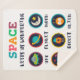 Playful space themed artwork made for curious kids and young students. Cute symbols like UFO, planet, moon, stars, rocket and alien help children explore space science and basic astronomy in a fun and friendly way.