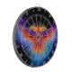 Fiery Phönix fliegt durch den Weltraum auf einer blauen und lila Nebel-Wolke. Der funkelnde Sternencluster, der den Kopf des mythischen Vogels krönt, bildet die Phönix-Konstellation. ♡ Idyllfire