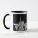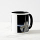 Space Shuttle Discovery überschneidet die dünne Linie der Erdatmosphäre, während sie mit der mit STS-131 ausgestatteten Internationalen Raumstation angedockt wird.