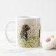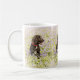 Tasse, die einen herrlichen schwarzen Arbeitscockerspaniel sitzt unter Bluebells im alten Waldland kennzeichnet