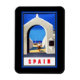 Vintage touristische und touristische Werbung für Spanien mit Architektur und einem Segelboot in Strandnähe. Ich fügte durchdacht entworfene, farbenfrohe grafische Gestaltungsgrenzen hinzu.