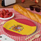 Dieses Design zeigt die Flagge Spaniens (bekannt auf Spanisch als "España"), offiziell als das Königreich Spanien bekannt (auf Spanisch "Reino de España"), ein Land im Südwesten Europas mit einigen Taschen von Territorium über die Straße von Gibraltar und den Atlantik. Das kontinentaleuropäische Gebiet liegt auf der iberischen Halbinsel. Außerdem machen die afrikanischen Enklaven Ceuta, Melilla und Peñón de Vélez de la Gomera Spanien zum einzigen europäischen Land, das eine physische Grenze zu einem afrikanischen Land hat, in diesem Fall Marokko. Das Festland des Landes grenzt im Süden und Osten an das Mittelmeer, mit Ausnahme einer kleinen Landgrenze zu Gibraltar, im Norden und Nordosten an Frankreich, Andorra und den Golf von Biskaya und im Westen und Nordwesten an Portugal bzw. den Atlantik. Die Hauptstadt und größte Stadt Spaniens ist Madrid. Weitere wichtige Städte in Spanien sind Barcelona, Valencia, Sevilla (Sevilla), Zaragoza, Málaga, Murcia, Palma, Las Palmas, Bilbao, Alicante, Córdoba, Valladolid, Vigo, Gijón (Xixón), L'Hospitalet de Llobregat, Vitoria-Gasteiz, A Elche und Granada.