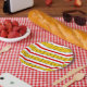 Dekoratives Retro-Design mit spanischem Geschmack, mit einem Streifen in Gold, Rot, Weiß und Schwarz Swirl-Verzierung. Erstellt zur Koordinierung mit dem spanischen Souvenirprogramm Zuhause-Zubehör und Party-Zubehör.