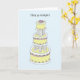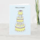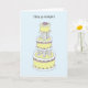 Ein mehrstufiger, stylischer Hochzeitstorte, Set vor einem blass blauen Hintergrund. Die Worte "Heute und ewig" sind auf Spanisch über dem Bild des Kuchens geschrieben.