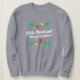 Ein lustiger, hässlicher Weihnachtspulli in Spanisch und Englisch. Es heißt "Kostüm Feliz navidad!" und "Frohe Weihnachten." Das Design ist sehr festlich, aber einfach.