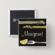 Rauer und bunter grüner und lila Spargel mit weißem Gabel- und Zitronenkeil, fantastischem Namensumbauknopf oder Abzeichen für einen persönlichen oder privaten Koch, Lebensmittellieferanten oder Catering, kochenden Klassen oder anderer Nahrung, Kochen oder kulinarischem Geschäft.